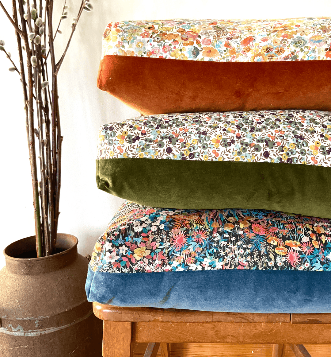 Using an invisible zipper and boxed corners, this pattern is a great way to use two complementary project cuts such as the Liberty Tana Lawn and Eider Velvet combinations pictured above.