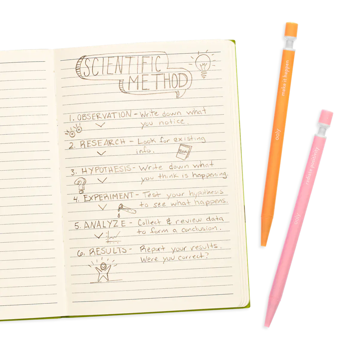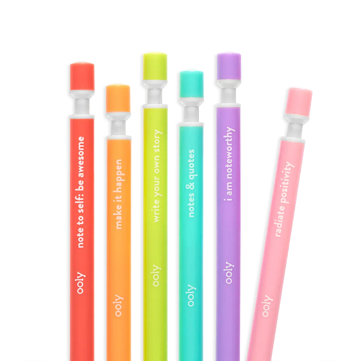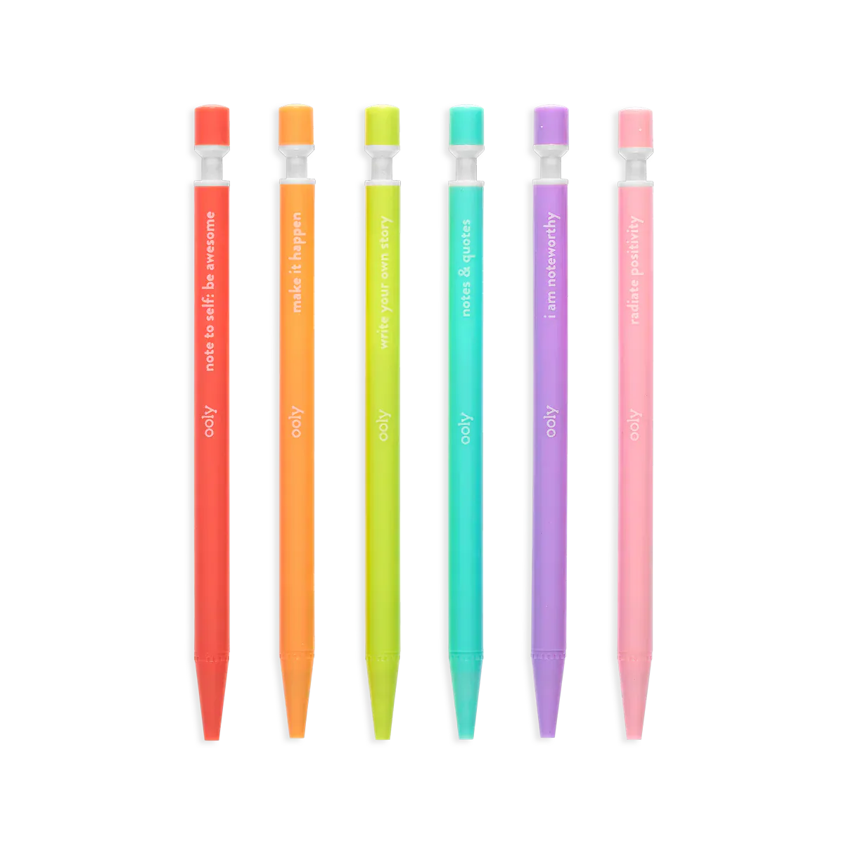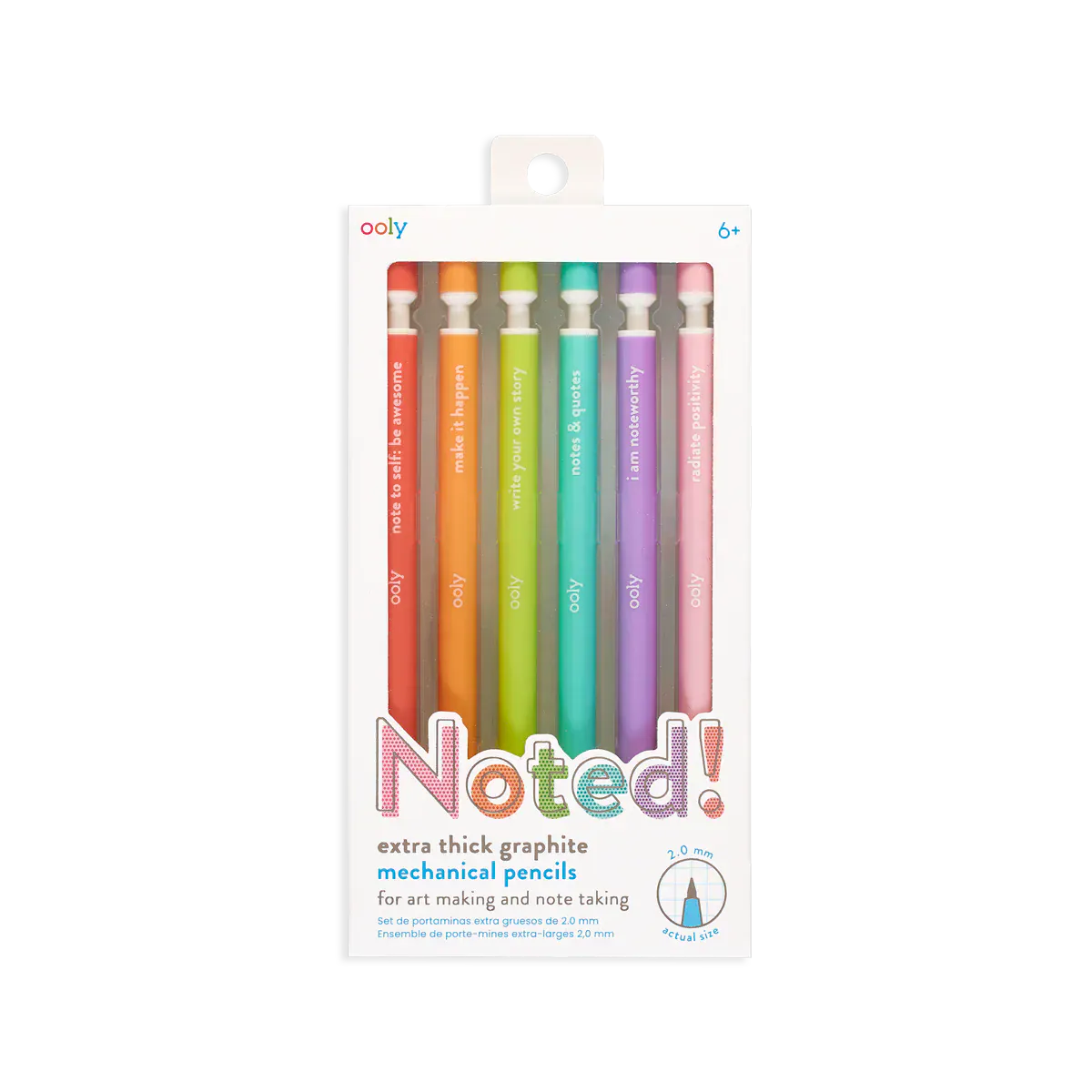 Get inspired to write or sketch with these extra thick leaded graphite mechanical pencils. Each of these 6 colorful barreled pencils has its own inspiring message. Noted! Graphite Mechanical Pencils are ready to get down to work or fun! Noted! Mechanical Pencils are pre-loaded with 2mm extra thick No 2 graphite lead and even have a lead sharpener on the top of each pencil. To give you a bit of inspiration, each of the 6 colorful pencil barrels has a motivating quote to keep your spirits up.