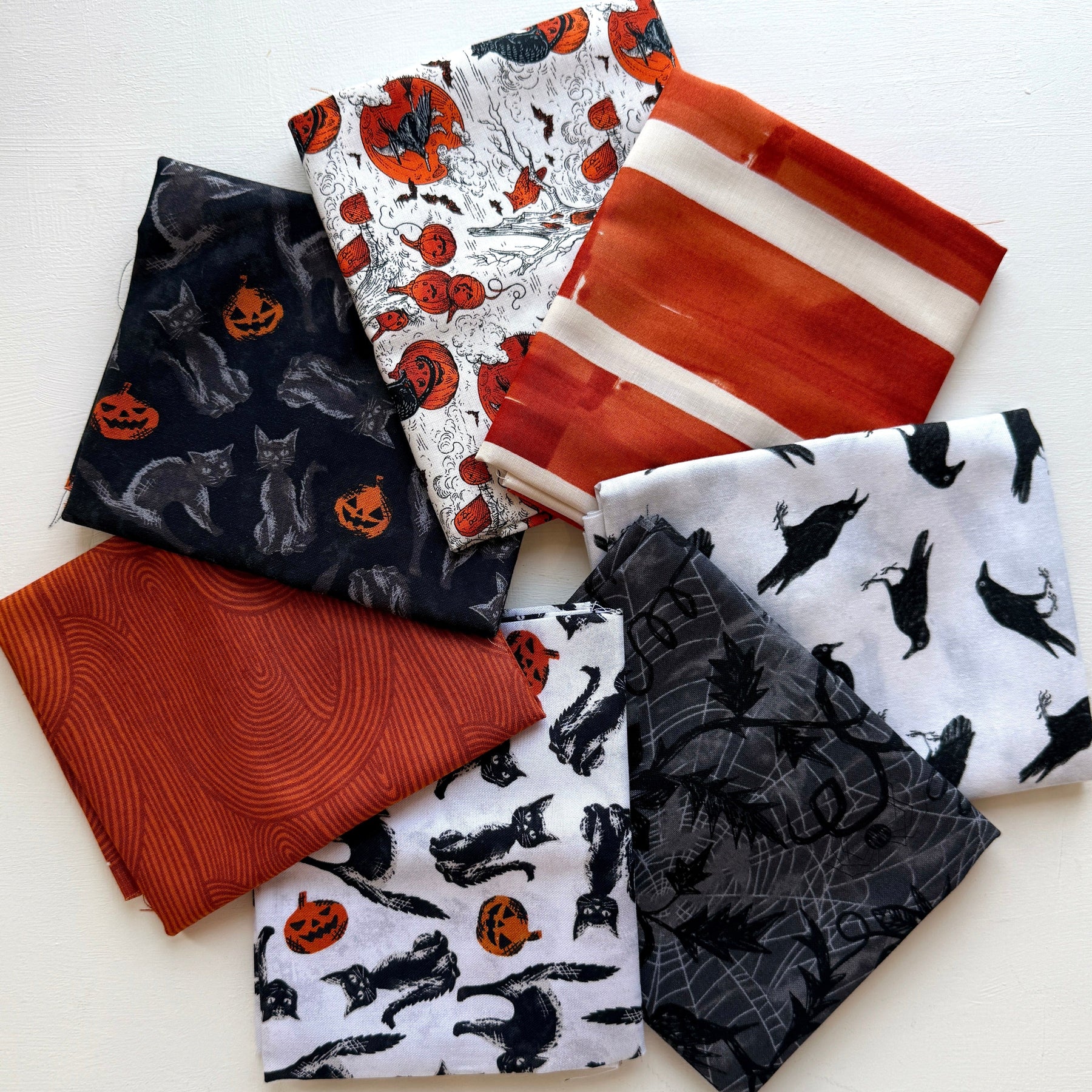The All Hallow's Eve bundle is a spooktacular bundle featuring traditional Halloween color palette with orange, black, and white quilting cottons. This bundle contains 7 fat quarters.