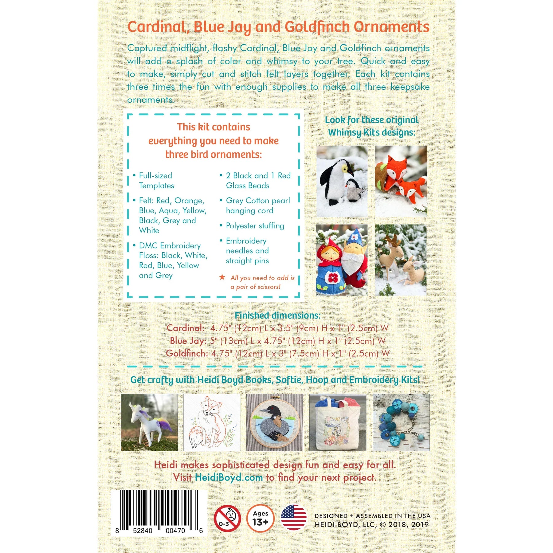 Captured midflight, flashy Cardinal, Blue Jay and Goldfinch ornaments will add a splash of color and whimsy to your tree. Quick and easy to make, simply cut and stitch felt layers together. Each Kit contains three times the fun with enough supplies to make all three keepsake ornaments.