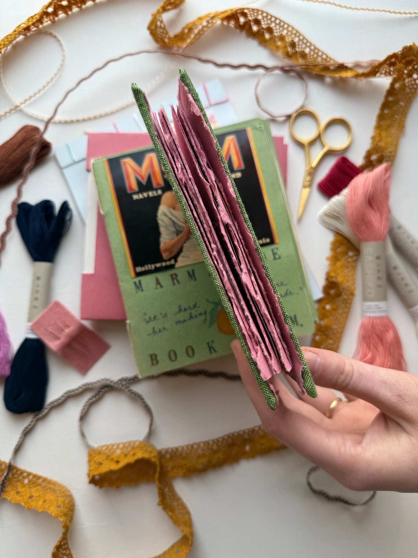 You’ll have the option to explore several styles, including a simple fold-and-tuck accordion book—perfect for collaging a poem or small project—or the Japanese Blanket Binding for an easy, polished look. Use your own scraps or choose a fat quarter in the store to create a single-signature, stitched hard-cover book that’s uniquely yours. For those ready to try something a bit more involved, the Penland Bind is a satisfying structure ideal for journals, poetry collections, or family recipes. Make multiple simple blank books or focus on one and start filling it with photos, watercolors, or collage.